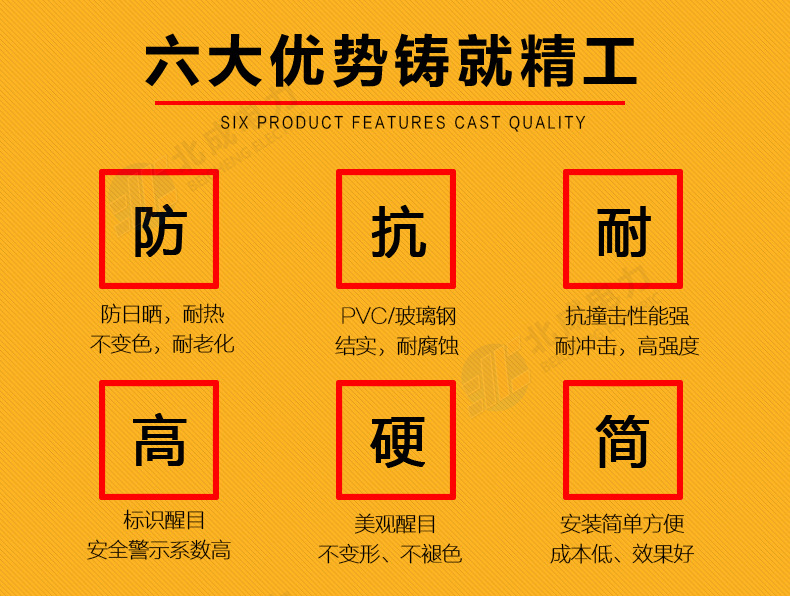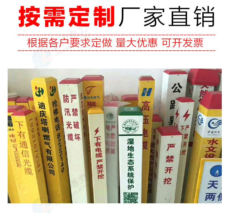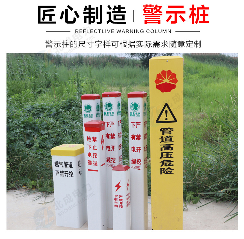 標志樁按用途分為: 電纜標志樁、油氣標志樁、通信標志樁、光纜標志樁、自來水標志樁、鐵路標志樁、公路里程樁。 性能指標: 1、拉伸強度≥160MPa 2、彎曲強度≥190MPa 3、浸水后彎曲強度≥150MPa 4、巴氏硬度≥38 5、環鋼度(5%)≥50KPa 6、熱變形溫度≥160℃ 7、氧指數26% 石家莊北成電力科技有限公司 聯系電話: 17603245663(微信同號) / 0311-67593878
